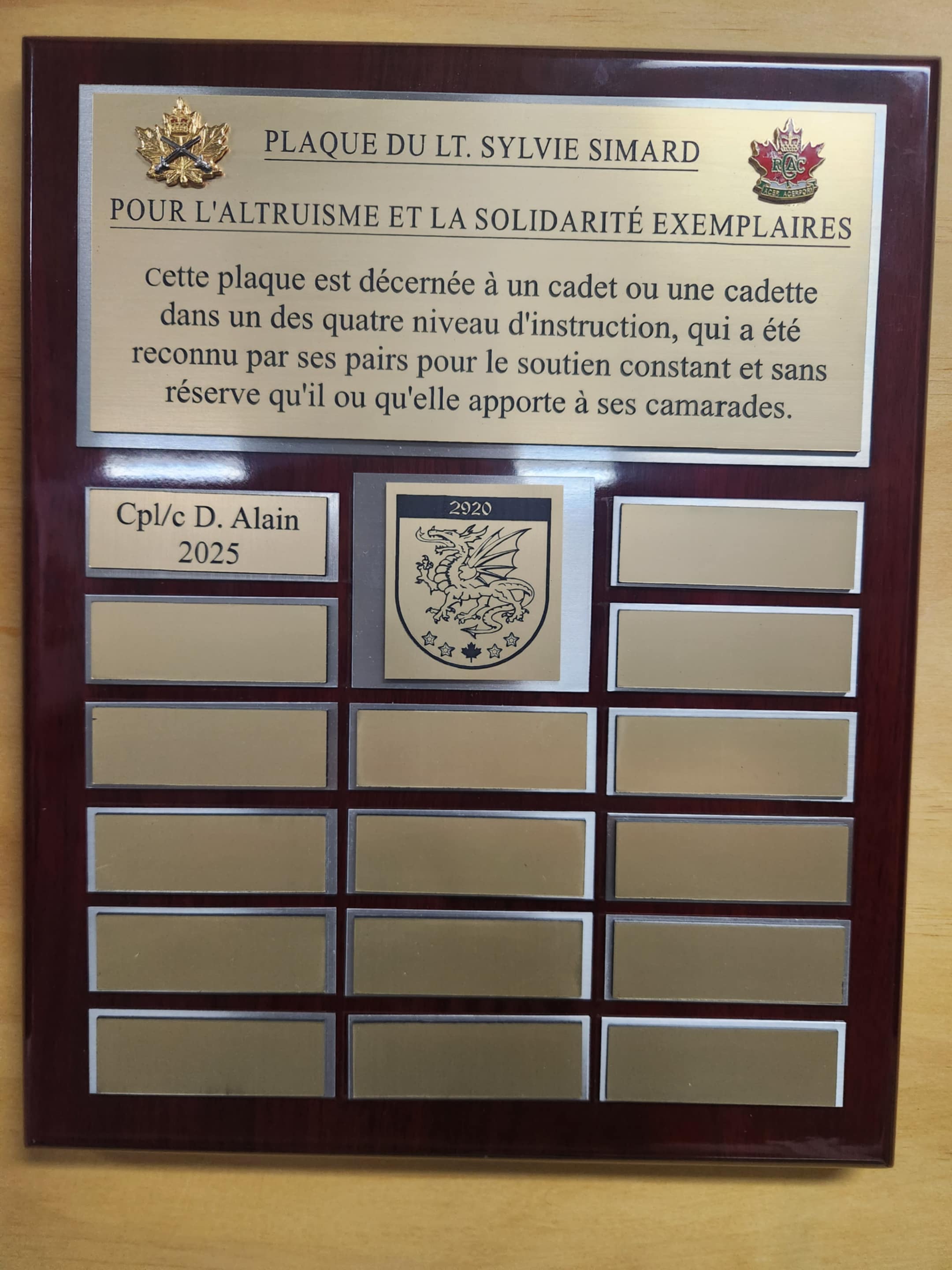 Cette plaque est décernée à un cadet ou une cadette dans une des quatre niveaux d’instruction, qui a été reconnu par ses pairs pour le soutien constant et sans réserve qu’il ou qu’elle apporte à ses camarades.